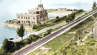 In 1923, Robert Hotung's adopted son Ho Sai Wing brought a plot of reclaimed land on the shore of Sha Tin Hoi next to the former KCR railway, and built a holiday mansion on it. Referencing Lake Windermere in the United Kingdom, the mansion was named Windermere (Chinese: 海天漁廬).[2] The mansion was also known as Ho Tung Lau (Chinese: 何東樓) and Eight Pointed Lau (Chinese: 八角樓) by the locals. The mansion's main building was built in a Colonial style with an encompassing veranda. It is two storeys tall, with two Cant Bays on both sides of the main entrance terminating on the second floor, its roof serves as a balcony. A octagonal pavilion stands points out from the top of the structure (hence the name Eight Pointed Lau). In addition to the main building, staircases connect to an accompanying two-storey living quarter on the side of the mansion.[4] There also stands a colonnaded single storey building detached from the main mansion on the other side of the plot.[5] In front of the mansion is a sports ground.[6]