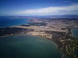 Hobart International Airport was opened in 1956 and privatised in 1988.[8] Occupying approximately 565 ha (1,400 acres) of land,[6] the airport is situated on a narrow peninsula. Take-offs and landings are inevitably directed over bodies of water regardless of approach or departure direction. The region immediately surrounding the airport remains largely unpopulated, which enables the airport to operate curfew-free services.[6]