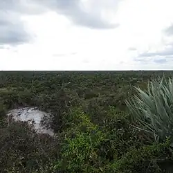 The hill occupies part of the Atlantic Coastal Ridge, a series of old dunes and beach ridges running latitudinally through the eastern side of the park, along and just west of U.S. Route 1. A relic of Pleistocene sea levels, it hosts arid, fine, well-drained soil.[1] At 86 ft (26 m),[2] Hobe Mountain marks the highest natural elevation locally and in South Florida below Lake Okeechobee.[a][1][3] Vegetatively it is covered by Florida scrub, mainly sand pine, oak, saw palmetto, and Florida rosemary;[2] its high elevation and scrub community correlate with biodiversity, including endemic species such as the Florida dancing lady orchid, the Florida scrub lizard, and the Florida scrub jay.[4][3]
