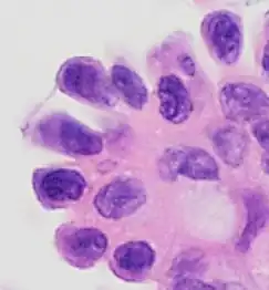 In histopathology, hobnailing is the presence of smooth projections from an epithelial surface, which generally contain nuclei. Hobnailing is seen in clear cell ovarian adenocarcinoma, collecting duct carcinoma, and in end-stage cirrhosis.[1][2]