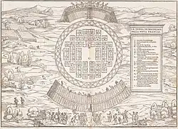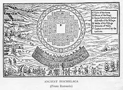 The original documentation that describes the village’s location is Bref récit et succincte narration de la navigation faite en MDXXXV et MDXXXVI, which Cartier gave to King Francis I of France in 1545. A plan exists titled La Terra de Hochelaga nella Nova Francia, which illustrates, in the European manner of the period, Cartier's original visit. Giacomo Gastaldi illustrated Hochelaga in the third volume of Delle navigationi et viaggi, a work done in Venice between 1550 and 1556 by Giovanni Battista Ramusio. The perfect, regular arrangement of the houses, conforming to the urban ideal of the Italian Renaissance, as well as the boards covering the village's palisade, were probably his own fabrications. If the plan faithfully illustrates the notes of the French explorer, it offers little resemblance to ethnohistorical reality.[8] A reproduction of La Terra de Hochelaga by Paul-Émile Borduas decorates the walls of the Grand Chalet of Mount Royal Park.