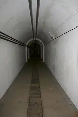 There was a basic design of storage and personnel tunnel. Storage tunnels incorporated a 600-millimetre (24 in) gauge railway in a loop running around the whole complex and a small platform for loading supplies; they usually had two entrances so that vehicles could continuously enter and exit the complex. Personnel tunnels were built like a grid; the railway was often removed after construction was complete.[2] Completed tunnels would have been lined in concrete, and have drainage, lighting, and air conditioning systems.[2]