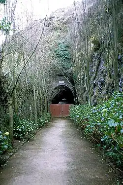 Where possible, the tunnel routes avoided granite and instead they were routed through looser shale rock formations; this speeded up construction and was less labour-intensive, but it could also be dangerous due to an increased risk of rockfalls. The tunnels were dug by the traditional method of drilling and blasting. When the tunnels were bored out, they were lined with concrete. First, the floor was lined, followed by the walls, and, finally, the roof. The walls were concreted using wooden shuttering, the space between the shuttering and the rock face was filled with concrete, and the shuttering subsequently removed. The roof was made in the same way, but using curved shuttering balancing on the concrete walls. Concrete was poured down the escape shafts rather than through the tunnel entrances to avoid contamination with the rock leaving the tunnel; these chutes can still be seen in many of the tunnels.[2]