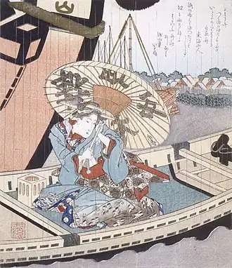 A representative work is Hokkei's illustrations for the kokkeibon comic novel by Ishikawa Masamochi Hokuri Jūniji ("The Twelve Hours of the Northern Village", referring to the pleasure district of Yoshiwara).[3] He produced few print series, one of which is the Famous Places from Various Provinces (諸国名所, Shokoku meisho)[2] of fifteen prints in 1835–36.[3] He also produced full-colour nishiki-e prints in a wide variety of genres, such as musha-e warrior prints and bijin-ga portraits of beauties, and made nikuhitsuga paintings.[1]