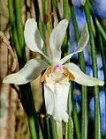 The flowers are white and wide open. The lip is three-lobed. The lateral lobes are erect and dotted adaxially. The central part is spread out over a large area and is parallel to the gynostemium. The lip is shaped to allow potential pollinators to depress the middle lip. The flowers have an elongated spur, which is strongly reduced in the subgenus Brachycentron. The gynostemium has a large scar area. The stamen contains two separate pollina. The stipes connecting the pollina and the adhesive disc (Viscidium) bend in the middle when removed from the rostellum. The rostellum is deeply incised.[4] The number of chromosomes is 2n = 38 in almost all species. Holcoglossum tsii has 76 chromosomes in the diploid chromosome set (2n = 76).[5]