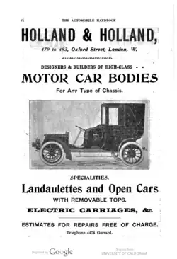 Holland & Holland products ranging from carriages through to coaches and limousine motor-bodies were built to exceptionally high standards often for clients in other countries.[1]