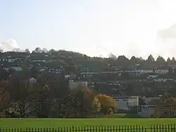 The building of Hollingbury housing estate, located on the north-western slopes of the hill, commenced in 1946.[3] The development is a mixture of bungalows, flats and houses with most of the earlier properties having large gardens. Some properties were originally owned by the local council and some were privately owned although a large number of the local council ones have since been sold. Some roads (Westfield Crescent for example) contained clusters of houses for use as armed forces or police service housing.[4] Most of these have been sold and are now privately owned.