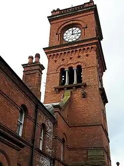 The hospital features a clock tower, construction of which was overseen by Lanyon and which, when illuminated at night, was used by boats to navigate the mouth of the nearby Six Mile Water river.[4]