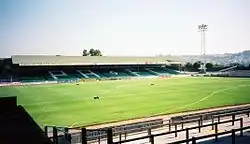 A new double-decker Grandstand was built in 1952, one of the last to be based on the template made popular during the 1920s and 30s by prolific football stadium architect Archibald Leitch, with floodlights installed in October 1953.[19] Running the length of the pitch, it had standing room in the first tier, known as the Mayflower Terrace, and wooden seating in the second tier.[24] When a roof was erected on the Lyndhurst side of the ground in 1964, three-quarters of the ground were under cover, with all but the second tier of the Grandstand being standing room. In the 1969–70 season seats were added at the back of the Mayflower Terrace, which took the seating capacity to 4,100 and the overall capacity to 40,000.[19] In the late 1970s the pitched roof at the Devonport End of the ground had to be removed for safety reasons.[4] It was replaced in 1984 by a non-pitched structure, leaving just the Barn Park End uncovered.[25]