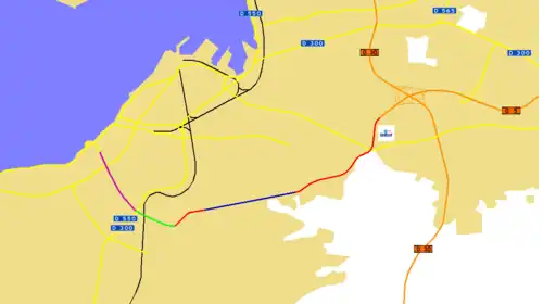 ![]() Homeros Blvd (green & red) together with the Buca-Bornova (blue) and Konak (purple) tunnels. Other main roads are in yellow, motorways are in orange. (Click to enlarge) | |