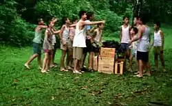 Kiat Kun's friends and Beng Soon's friends arguing after an agreement is reneged on, in a political allusion.[13]
