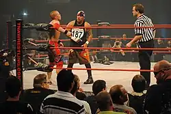 On September 10, 2010, Homicide made his return to the independent circuit at a Combat Zone Wrestling event, where he announced that his return match for the company would take place on October 9, when he would face Sami Callihan.[104] The following day he appeared for Evolve, confronting Johnny Gargano and Jon Moxley.[105] On October 9 Homicide defeated Sami Callihan in the main event of CZW's It's Always Bloody in Philadelphia.[106] On November 20 Homicide made his in-ring debut for Evolve, losing to Jon Moxley via controversial referee stoppage.[107] The following day Homicide made his debut for Chikara, losing to Eddie Kingston in the main event of the evening.[108] On December 11, 2010, at the Cage of Death XII pay-per-view, Homicide challenged Jon Moxley for the CZW World Heavyweight Championship, but was unsuccessful in dethroning the defending champion.[109] On December 19 Homicide unsuccessfully challenged Slyck Wagner Brown for the 2CW Heavyweight Championship at a Squared Circle Wrestling event.[110] In February 2011, Homicide travelled to Perth, Western Australia to compete at New Horizon Pro Wrestling's Battle of Honor event on February 11. He defeated Tama Williams in the main event to win the NHPW Art of Fighting Championship.[111][112]