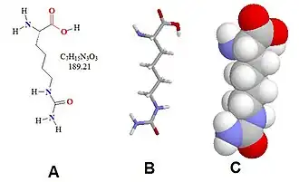 Homocitrulline is one methylene group longer than citrulline, but similar in structure. The metabolite is generated from a lysine residue after lysine reacts with cyanate. Cyanate is present in the human body in equilibrium with urea. Under physiological conditions the urea concentration may be too low to allow extensive carbamylation. However, the conversion process leading to the formation of homocitrulline from lysine in proteins is known to occur in vivo. During renal failure conditions, the urea concentration increases and carbamylation of many proteins can occur, which can be detected. It is believed that most carbamylation takes place during inflammation when the enzyme myeloperoxidase is released from neutrophils. This enzyme converts thiocyanate to cyanate. Increased levels of cyanate can now carbamylate lysine residues.
