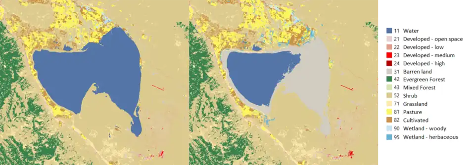 Honey Lake is an endorheic sink in the Honey Lake Valley[3] in northeastern California, near the Nevada border. Summer evaporation reduces the lake to a lower level of 12 square kilometers (3,000 acres) and creates an alkali flat. Honey Lake dries almost completely in most years.[4]
