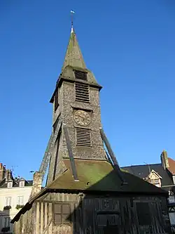 - Église Saint-Étienne (St. Stephen's Church) is an old parish church in Gothic style, dating in part to the 14th and 15th centuries.[17] It is the oldest church in the city. It is constructed of chalk with flint and of Caen stone, the city of Honfleur being located at the border of those two calcareous rock formations. The bell tower is covered with a façade essentage of chestnut wood. Today, it has become the Naval Museum.[17]