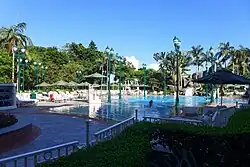 There are 2 pools in the resort, 1 indoors and 1 outdoors. The hotel also offers other facilities including a tennis court, a multi-function court, a Mickey-shaped maze and a grass field in which some kids activities take place in. The hotel also has a Victorian Spa which contains a gym. Every day and evening a talented jazz band plays in the main area of the hotel.[7]