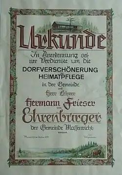 Within the Federal States, honorary citizenship (Ehrenbürgerschaft) is the highest distinction that can be awarded to an individual by a municipality.[1] It is awarded by cities, towns, and sometimes federal states. The honorary citizenship is perpetual and persists after the death of the honoree, but can be revoked in exceptional cases by the council or parliament of the city, town, or state. In the case of war criminals, all such honours were taken away by "Article VIII, section II, letter i of the directive 38 of the Allied Control Council for Germany" on 12 October 1946.