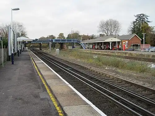 Hook railway station serves the large village of Hook and surrounding villages in Hampshire, southern England. it has two platforms, which serve the outer pair of tracks. The centre pair of tracks has no platforms, and is used by services that do not call at Hook.