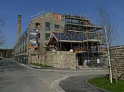 In 1837, two separately owned textile mills were built close together and in parallel, by the River Aire. They became known as the High Mill and Low Mill. The Low Mill was divided into two sections, each undertaking weaving, while the High Mill was a single operation, and undertook both spinning and weaving.[1] The 1841 census recorded that around 500 people, three-quarters of the Cononley workforce, were working in the textile industry.[2] From 1852, the two mills were under common ownership, although Low Mill was later demolished. In 1866, a further mill, the Aireside or New Mill, was constructed on the other side of the Aire, and in 1880, this mill was purchased by the owner of the High Mill, which later became known as Station Mill.[1] Despite these changes, by 1881, the proportion of textile workers had declined to under one half of those employed in Cononley.[2]