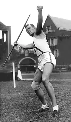 Odell repeated as IC4A champion in 1934, defeating Stanford's Johnny Mottram, who had been the favorite.[7] The following week, aided by a tailwind,[8] he threw 221 ft 11 in (67.64 m) at the N.Y.A.C. Games; it was the best throw by an American that year, within a foot of James DeMers's American record,[8][9][10] and remained a meeting record until 1963.[11] Despite this, Odell only placed fourth at the 1934 national championships[6] and fifth at the NCAA championships.[12]