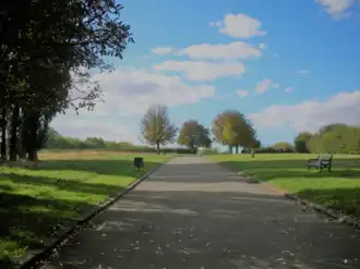 Horn Park is a public park, within Horn Park in the Eltham area of the Royal Borough of Greenwich.[8][9][4] It is 530 m (580 yd) long east to west, and 120 m (130 yd) across north to south, but widens to about 180 m (200 yd) across at the eastern side,[4] to give the park a total area of 16 acres (6.5 ha). It contains an outdoor gym, a playground,[10] a floodlit multi-use game court and a skate park,[9][11] the first skate park to be constructed in the Royal Borough of Greenwich.[8] Horn Park is on a hill, the eastern edge of the park has a height of about 32 m (105 ft) above sea level, which rises to around a height 50 m (160 ft) on the west side of the park,[12] giving views of the surrounding area.[8]