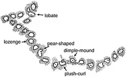 Comparisons of different fossils in the same locations suggest that it rearranged itself into fewer but larger main masses as the sediment grew deeper round its base.[3] It may also have had a series of holdfasts along the bottom of the thread. Dimple marks in offshore sandstone have been found in the same deposits as Horodyskia, suggesting that they may be remnants of older holdfasts.[4] Thin sections of Horodyskia have revealed a system of tubes within the beads, including connecting strings, and other tubes radiating outward from each bead. Partial burial and branching of these tubes suggest that it may have had a benthic sessile lifestyle. Members of the genus are distinguished by bead size and spacing, with the beads of H. moniliformis being larger and more spaced than H. minor.[2]