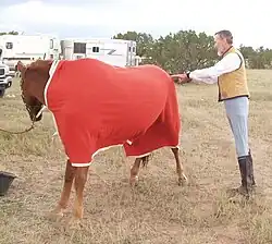 A horse blanket or rug is a blanket or animal coat intended for keeping a horse or other equine warm or otherwise protected from wind or other elements. They are tailored to fit around a horse's body from chest to rump, with straps crossing underneath the belly to secure the blanket yet allowing the horse to move about freely. Most have one or two straps that buckle in front, but a few designs have a closed front and must be slipped over a horse's head. Some designs also have small straps that loop lightly around the horse's hind legs to prevent the blanket from slipping sideways.[1]
