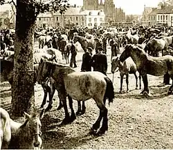 Buyers were highly varied and hierarchical, from Parisian merchants to small-scale local "traffickers". The Parisian merchants, nicknamed "the French" because they didn't speak Breton, sent brokers supported by an interpreter who translated the buyer's wishes from French into Breton.[134] The Foire Haute de Morlaix brings together 7,000 horses in September.[135] All sales are conducted orally. If the animal has a hidden defect such as a tic à l'appui (tik-koad) or a tic à l'air (tik-aer), the sale may be cancelled or revised.[136] Some unscrupulous dealers make up horses to increase their selling price: this may involve putting nitrate on a tooth to hide its worn state,[137] putting a mustard poultice on the back to make it look less hollow, or hitting the legs with a boxwood hammer to make them look fuller. Some traffickers inflate the animal's rump with a bicycle pump and hypodermic needle, or introduce ginger or pepper into the anus to make them look more vigorous. There are also techniques for calming nervous horses by tying their tongues together for the duration of the sale, or for depreciating an animal by mixing finely chopped horsehair into its food, causing it to cough. These techniques are mainly used by Bretons with foreigners, not between people who know each other.[138] As the century progressed, most horse fairs disappeared, due to the lack of use of horse-drawn vehicles. Only a few survived, such as the Kerien fair, which continued in 1986.[139]