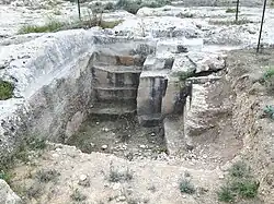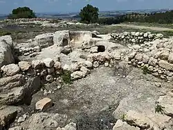 From 1978 to 1980, and again in 1983, the site was excavated under the direction of M. Gichon and Mi. Fischer from Tel Aviv University.[6][3] These excavations revealed a 30-meter section of a wall at the southwestern summit of the hill, constructed with roughly hewn stones and fillers. The wall's thickness was approximately 2.5 meters, and it was preserved up to 3 meters high. In 1980, the excavations focused on uncovering semi-circular towers flanking the southern gate of the site. These towers were based on natural rock and filler, and evidence suggested they were destroyed during the First Jewish–Roman War and reconstructed in the Bar Kokhba revolt.[6]
