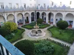 In 1890, the building was converted into an ad hoc hospital facility in response to a flu epidemic. In 1903, the building was put under the direct responsibility of the Ministry of the Kingdom, and it became part of the city's main hospital centre, then collectively known as "Saint Joseph's Hospital and Annexes" (Hospital de São José e Anexos) and from 1913, called the "Civil Hospitals of Lisbon" (Hospitais Civis de Lisboa, HCL).[3] In 1905–1908, it underwent profound renovation works, overseen by engineer Luís de Melo, to make it suitable as an hospital for venereal diseases: it now had a total of 700 beds, an operating room, a morgue, and an outpatient clinic; fully equipped with a lift and electric light. In 1910, it was renamed "Hintze Ribeiro Hospital", and it became affiliated with the Lisbon Medical-Surgical School; in 1911, following the 5 October 1910 revolution, it was renamed "Lisbon Faculty of Medicine Teaching Hospital" (Hospital Escolar da Faculdade de Medicina de Lisboa"); only in 1922 did it receive administrative and financial autonomy. In 1953, the recently built Saint Mary's Hospital became the city's teaching hospital.[2]