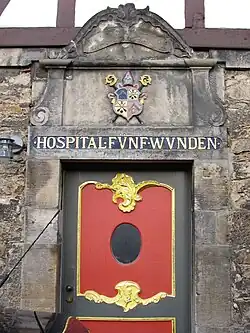 In 1770, a large half-timbered house was built in Hildesheim to house two different hospitals which had already been founded several centuries before. The ground floor was given to the Hospital zu den Fünf Wunden (Hospital of the Five Wounds) and the upper floors to the Hospital Sankt Nicolai (Hospital St. Nicolai). Later, both hospitals were united to form the Vereinigte Hospitäler (United Hospitals). The building, however, kept the name Hospital zu den Fünf Wunden.[1] The name derives from devotion to the holy wounds inflicted on Jesus during the crucifixion, a pious practice traditionally associated with works of mercy and social justice (in reformation England the Pilgrimage of Grace was undertaken by Catholics protesting their loss of charitable institutions and religious freedoms, under a similar patronage). From the 19th century on, the building was used by a nearby Catholic hospital which still exists today.