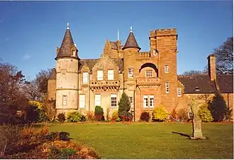 A hospital was founded on the site in the 13th century by monks from nearby Arbroath Abbey as a leprosy and plague hospice called the Hospital of St John the Baptist.[1][2][8] The property was purchased by the Reverend James Fraser around 1664 and was subsequently owned by successive generations of the Fraser family. Walter Scott visited the house in 1813, and he used it as the model for "Monkbarns" in his novel The Antiquary (1816).[1]