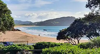 Hot Water Beach is a beach on the east coast of the Coromandel Peninsula, New Zealand, just south of Mercury Bay.[1] It is approximately 12 kilometres south east of Whitianga, and approximately 175 kilometres from Auckland by car. Its name comes from underground hot springs that filter up through the sand between the high and low water tidal reaches. The beach is a popular destination both for locals and tourists. Annual visitor numbers have been estimated at 700,000, making it one of the most popular geothermal attractions in the Waikato region.[2]
