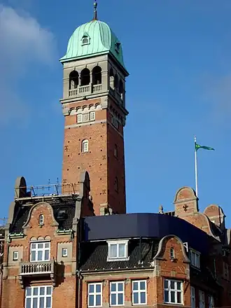 The three-wing building is constructed in red brick with granite rustication on the ground storey. The most distinctive feature of the building is its tower which stands 50 metres tall and is capped by a copper roof.[1]