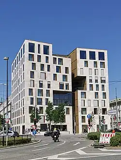 The hotel is located in the Munich city district named Ludwigsvorstadt, just few meters west of the historic square named Karlsplatz (Stachus). Originally, a roundabout similar to the east side of the square was planned, yet it was never realized. The hotel is situated in the apex of the proposed half-circle across from the Karlstor.