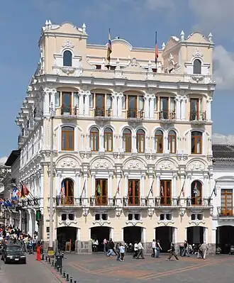It was the first building in Quito to be more than two storeys at five, when it was built in 1930.[5][6] It was one of the first formal hotels in Quito, originally becoming the Majestic Hotel in 1943.[7] As of 1986 it was still the Majestic Hotel,[8] but it later closed and became a bank and then as administrative offices for the municipality of Quito. In 1978, this Old Town area became one of the first UNESCO "World Heritage Site", and is the largest site in Latin America. In 2005 a group of hoteliers provided investment to restore the building to its former glory.[7]