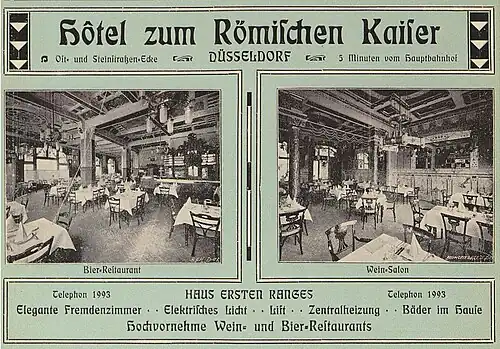 - ^ Architekten- und Ingenieur-Verein zu Düsseldorf (Hrsg.): Düsseldorf und seine Bauten. L. Schwann, Düsseldorf 1904, pp. 305, 315–16 [Abb. 387 Römischer Kaiser, Grundriss Erdgeschoss] [Abb. 388 Römischer Kaiser, Grundriss 1. Stockwerk] [Abb. 389 Römischer Kaiser, Ansicht] [Abb. 390 Innenraum des „Römischen Kaisers“].