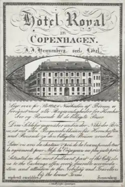 The writer Bernhard Severin Ingemann who lived at Sorø Academy stayed in Hotel Royal during his visits to Copenhagen. The writer Hans Christian Andersen for a while had his home in the hotel. The Swedish singer Jenny Lind stayed at the hotel in 1845. One day prior to her departure, on 21 October, she held a dinner there for her Copenhagen friends which included Hans Christian Andersen.[2]