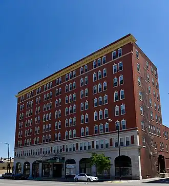 The Hotel Russell-Lamson is a historic building located in Waterloo, Iowa, United States. Clyde O. Lamson, a real estate developer, and his wife Lillian Russell Lamson were instrumental in the construction of the hotel. Completed in 1914, it uses their family names for its name.[2] The Chicago architectural firm of Marshall & Fox designed the eight-story Georgian Revival building. It utilizes the base-shaft-capital configuration that is typical for this building type.[2] The base is composed of rusticated Bedford limestone, which extends to the mezzanine level. The shaft is six floors of red brick veneer. It contrasts with the limestone trim. The capital is a rather simple cornice composed of moldings and a row of dentils.