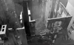 Large parts of the hotel complex were damaged in a 16-alarm fire on August 26, 1995,[101][102] in the city's largest fire in over two decades.[103] The St. George Hotel's guests first reported smoke at 3 a.m., but the hotel's staff did not contact the New York City Fire Department (FDNY) because its alarm system did not indicate any issues. Although firefighters arrived at the hotel in 3:36 a.m.,[104] they were initially unable to locate the fire.[101] The FDNY eventually identified the fire as having come from the Clark Building.[101][104] After firefighters entered the building, they discovered that the building's standpipe was not functional, during which time the fire spread rapidly.[105] By the time firefighters connected the hose to a standpipe outside the building, the fire had begun to produce a large volume of fire brands, some of which drifted into apartments.[106] As additional companies arrived, they began evacuating the buildings on Clark and Hicks Streets,[107] and the top floors of the Clark and Marquee buildings burned down.[107] More than 700 firefighters and 100 companies ultimately responded to the fire,[108] which was declared under control at 7:09 a.m.[109] Although no one died in the fire, it took many days to extinguish all the fires and spot fires in the area.[108][110]