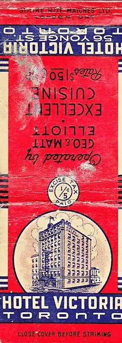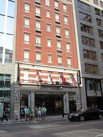 Hotel Victoria is a historic boutique hotel located at 56 Yonge Street in Toronto, Ontario, Canada. The hotel opened in 1909 as the Hotel Mossop and was celebrated for being a fireproof building, constructed after Toronto's Great Fire of 1904.[1] It has been designated a Heritage Building by the City of Toronto government.