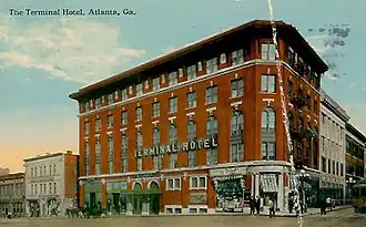 Following the war, Atlanta rebounded and began to rebuild at a rapid pace. New hotels arose to replace those lost during the war, including the Kimball House (1870) and the Markham House (1875). While many of the hotels before and after the war were built around State Square in downtown Atlanta, by the 1890s many of the newer hotels were being built north of the area along "upper Peachtree". Some of these notable buildings included the Majestic Hotel (1898) and the Piedmont Hotel (1903).[6][7] Also starting around this time, several hotels opened on Hotel Row near the newly opened Terminal Station in South Downtown. Among these was the Terminal Hotel, built in 1906 by prominent Atlanta businessman Samuel M. Inman.[8] However, stiff competition from other hotels in downtown caused the area to experience a decline a few decades later.[9]