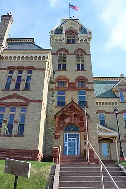 Houghton County, Michigan, was first organized in 1845; at the time it covered the entire Keweenaw Peninsula, with Eagle River as the county seat.[2] In 1861, the county was split in two, with the northern part of the Keweenaw, including Eagle River, forming Keweenaw County and the southern part remaining Houghton County.[2] The village of Houghton was designated the county seat, and a frame structure was erected in 1862 to serve as the courthouse. However, the booming copper industry in the Keweenaw quickly swelled the populace of Houghton County, and a new courthouse was planned to demonstrate the area's prosperity. The county hired Marquette architect J. B. Sweatt to design the courthouse, which was built on the site of the older courthouse at a cost of $75,568.00.[3] The cornerstone, with a miner's coat of arms, was laid on July 24, 1886,[4] and the new courthouse was dedicated on July 28, 1887.[2]