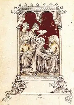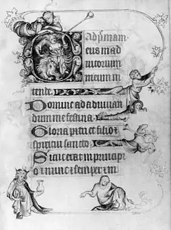 The text is unusual in that the saints' days noted in the calendar, and those mentioned in the litany, are clearly those of Paris, featuring all the otherwise obscure local saints one would expect, such as Saint Cloud and Saint Germain. However the rest of the text follows forms typical of hours written for members of the Dominican order. It is possible that two different models were accidentally used by the scribes, though this seems somewhat careless in a major royal commission.[6] But Queen Jeanne was especially close to the Dominicans, so the mixture of texts may be deliberate.[7] Various mistakes in other parts of the book are corrected, which for appearance's sake they often are not in luxury books, but the calendar has no corrections, despite misspelling over 30 saints' names, and giving 15 the wrong feast days.[8]