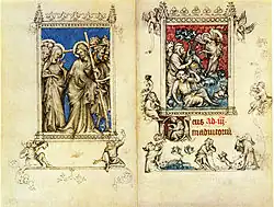 The miniatures use a variety of grisaille drawing in pen known (or at least so called in an inventory that included this work) as "de blanc et noir" and tempera for the other colours. Using both grisaille and colour together is a technique known as “camaïeu gris”. The full-page paintings include cycles of what are always the most commonly found phases of the Life of Christ, the Passion and Infancy. These illustrate the Hours of the Virgin, which is found in some other books of hours, but most unusually they are arranged on facing pages showing a scene from the Passion on the left and from the Infancy on the right, with eight pairs of scenes.[4] However such an arrangement is often found in the ivory diptychs that were being produced in great numbers in Paris at this period.[5] Another cycle shows nine scenes from the life of the Saint-King Louis IX of France decorating the office dedicated to him. Saint Louis was the great-grandfather of both Queen Jeanne and her husband Charles IV, who were first cousins.