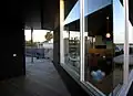 The structure is a low, black, flat and very long building which largely obscures the lake, appearing as a black smudge in the landscape and creating shadow surrounded by forest. University of Queenslands Dr John MacArthur has stated that “the silhouette is similar to that of the black swans that occupy the lake. It forms a conversation with nature by adapting to its language as a part of landscape, a windbreak on the ridge, and an interval on the horizon.”[1]