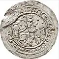 Adalbert II of Ballenstedt, son of Esico and his wife Matilda, was a count in the Nordthüringgau and is mentioned in connection with the Nizizi and Serimunt counties.[10] It is presumed that his mother was the daughter of Duke Herman of Swabia. He married Adelheid, daughter and heiress presumptive of Count Otto I of Weimar-Orlamünde, Margrave of Meissen, and had two sons, Otto the Rich and Siegfried. Adalbert was killed around 1080 by Egeno II of Konradsburg. While speculations about the motive exist, the reasons remain unclear. A seal depicting Adalbert exists,[11] representing the earliest known stylized depiction of an Askanier.