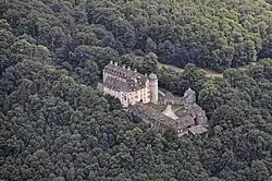From the mid 13th century on, two branches of the Asseburg family emerged: an elder Eastphalian-Thuringian branch and a younger Westphalian branch. The former had its initial seat at Moringen Castle, later also at Ampfurth near Oschersleben. In 1437, Falkenstein Castle in the Lower Harz was acquired as an enfeoffment of the bishops of Halberstadt. In 1509, Wallhausen was also acquired, initially as an enfeoffment of the County of Mansfeld, later of the Electorate of Saxony. Meisdorf House near Falkenstein later became the permanent residence of the branch, while Falkenstein Castle was used for hunting parties.