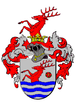 Escutcheon: Argent, to a naissant stag Gules, mouv, of three fess wavy Azure in base and accompanied in chief in sinister of a rose of the second. Crest: an issuant stag Gules.[6]