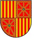 The first, of the Fernández de Híjar , shows the fusion of the lineages of Aragon and Navarra. In the shield of Pedro Fernández de Híjar (the bastard son who King Jaime I of Aragon had from Doña Isabel Berenguela Fernández, granddaughter of the King of Navarra) we can see the five golden vertical bands alternated by four red vertical bands (de cuatro palos gules) symbol of Aragon and the golden chains, symbol of Navarra, framed and cross-shaped with, in the middle, an emerald on a red background.